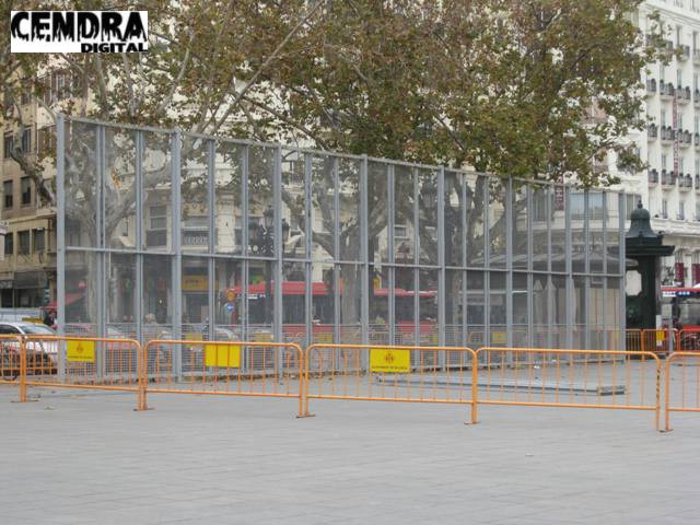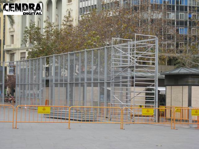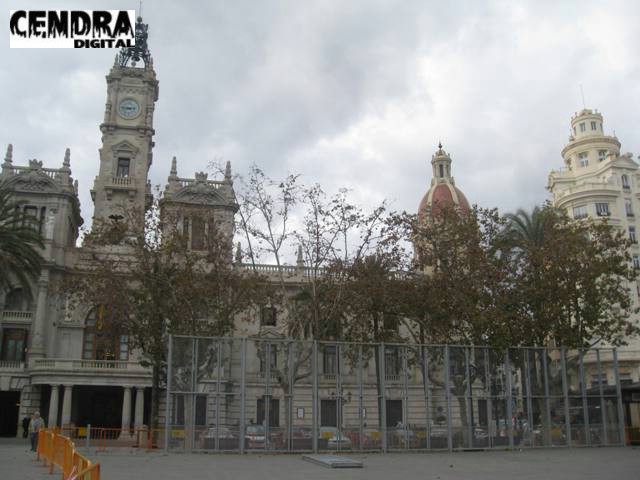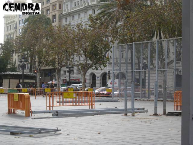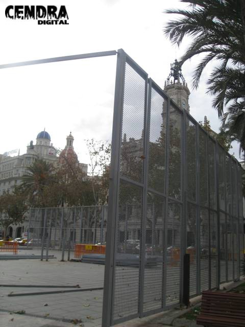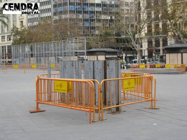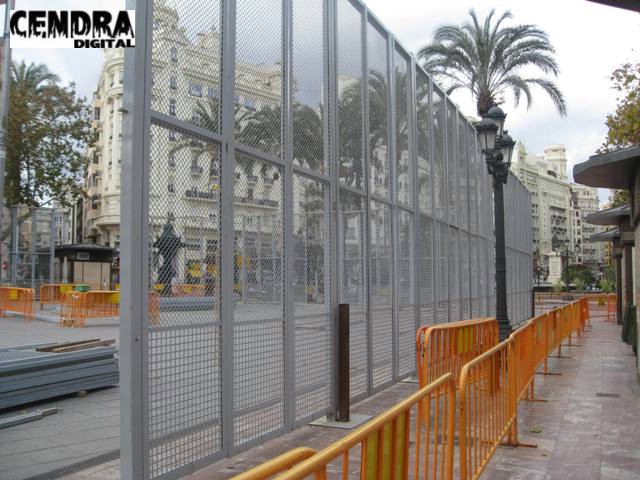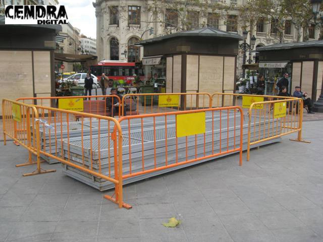 Los operarios han iniciado el montaje de la valla de seguridad para las mascletaes que se dispararán en la plaza del ayuntamiento a partir del 1 de marzo.