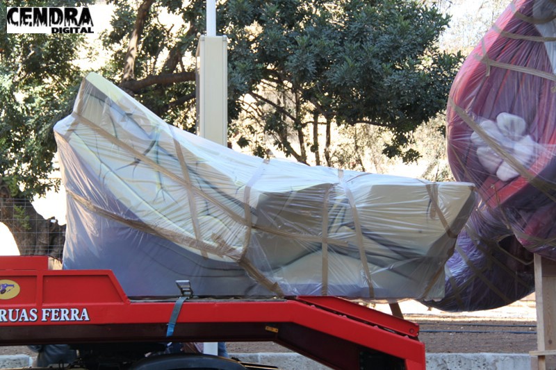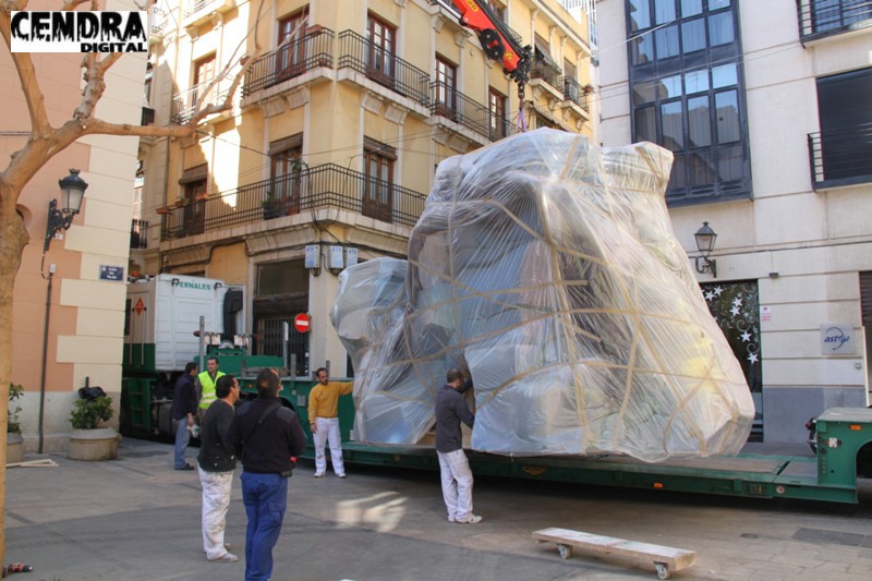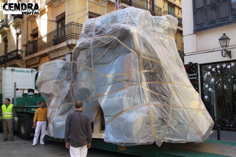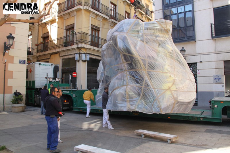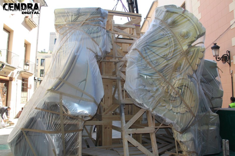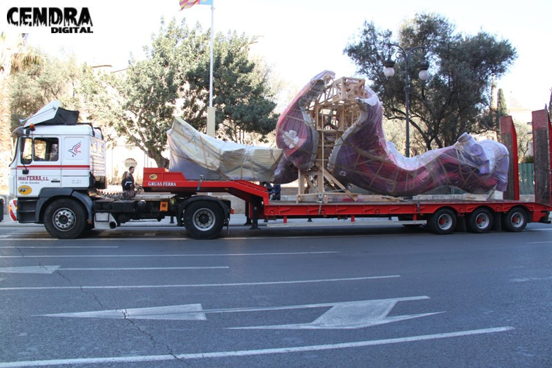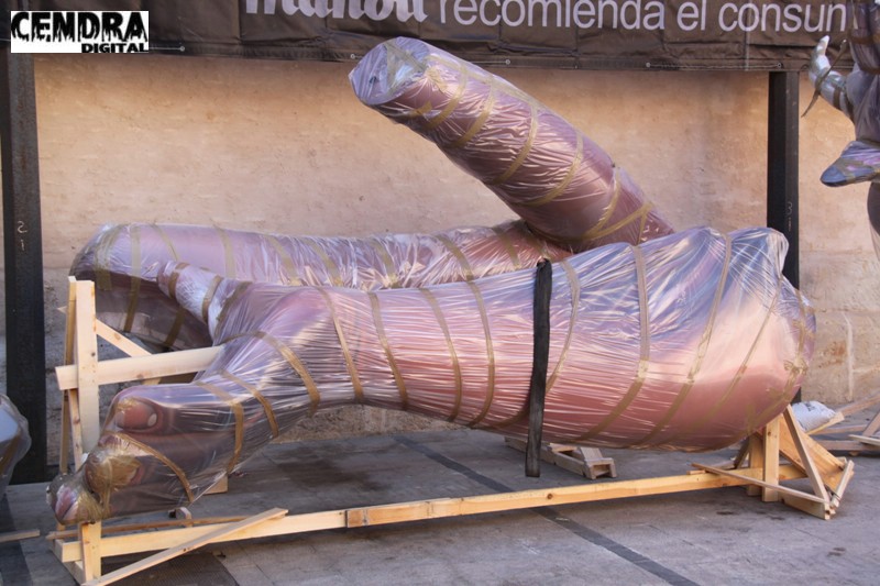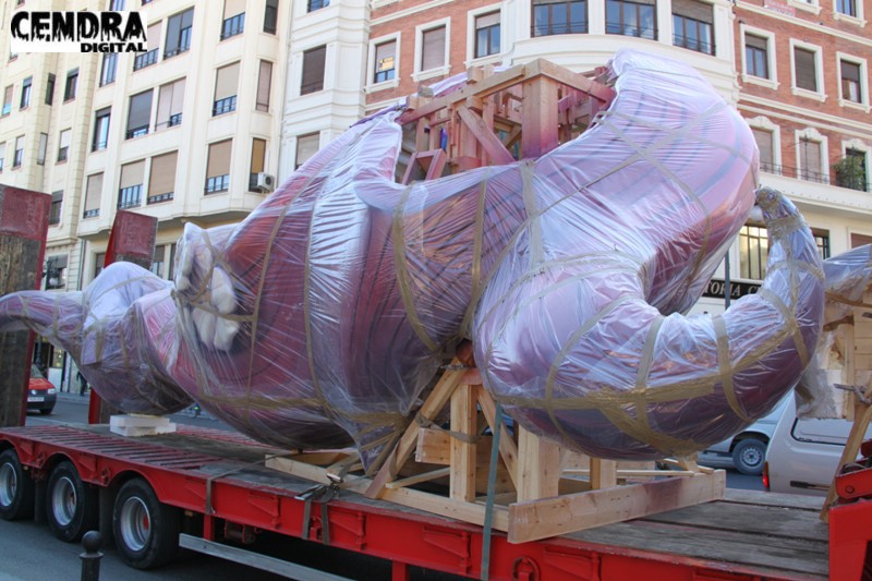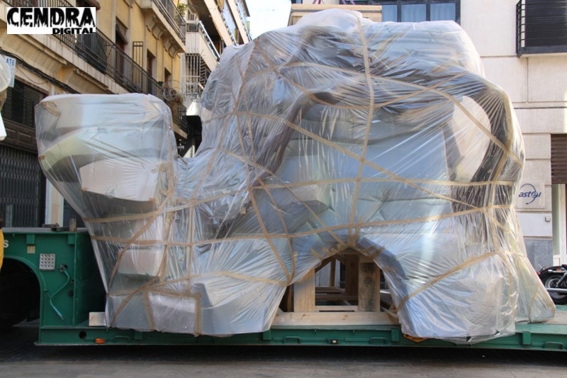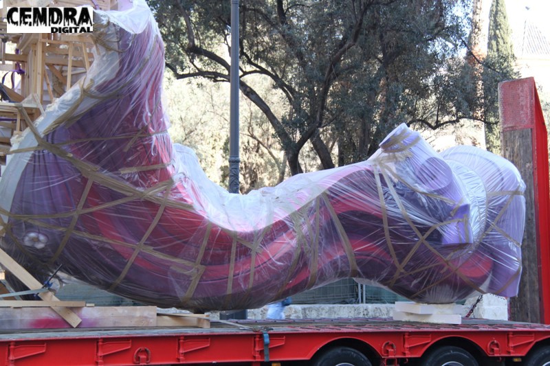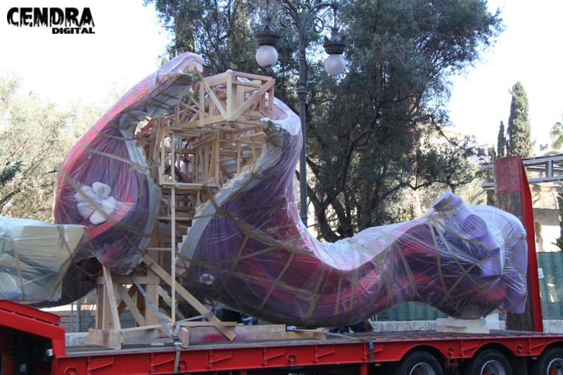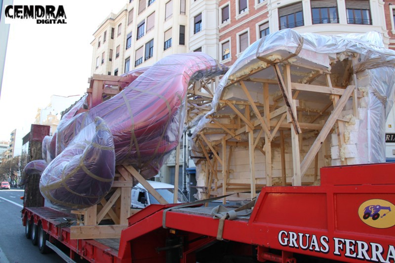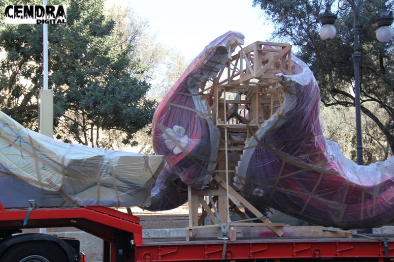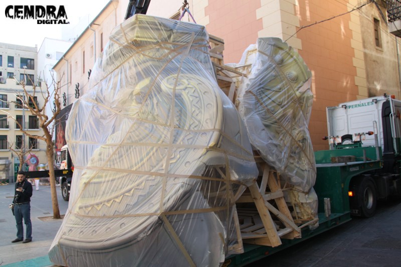 Fotografías de las primeras piezas que han llegado a la Plaza del Pilar de la falla que está realizando José Sanchis.