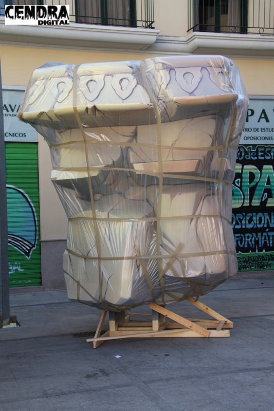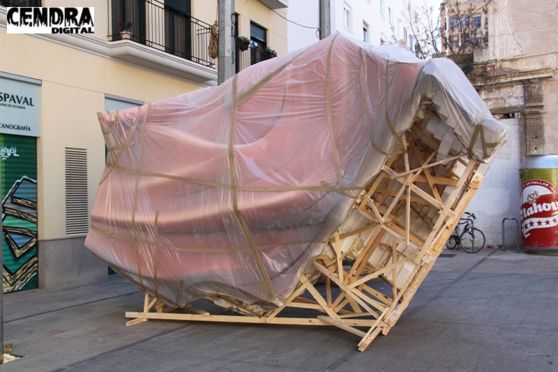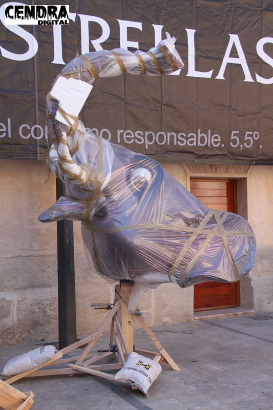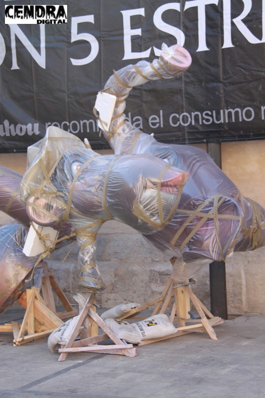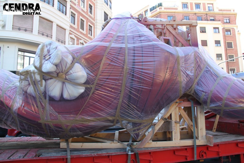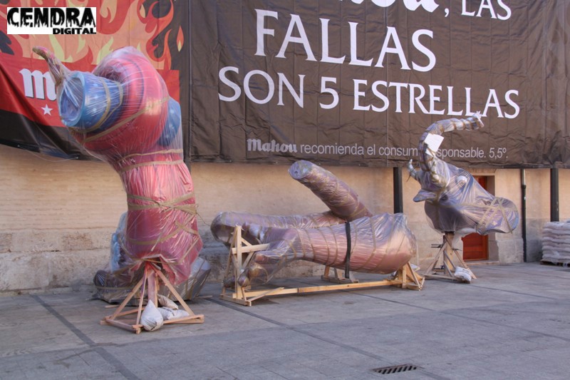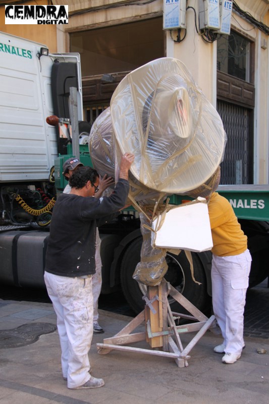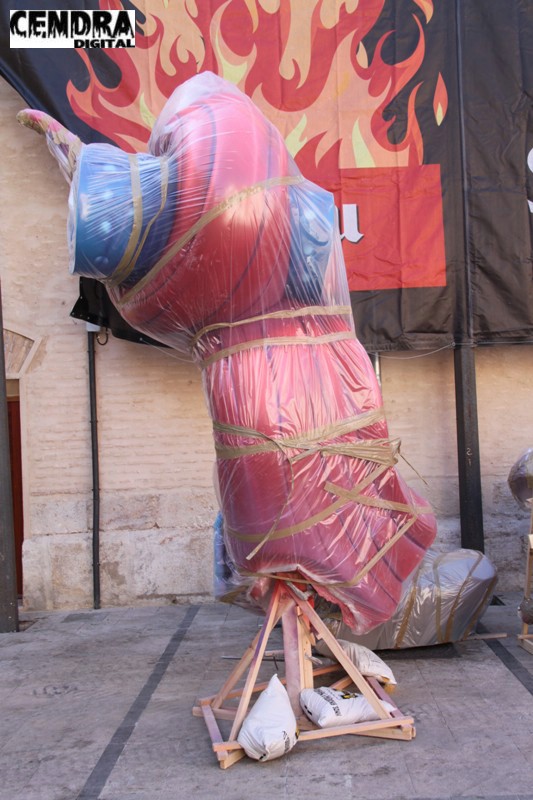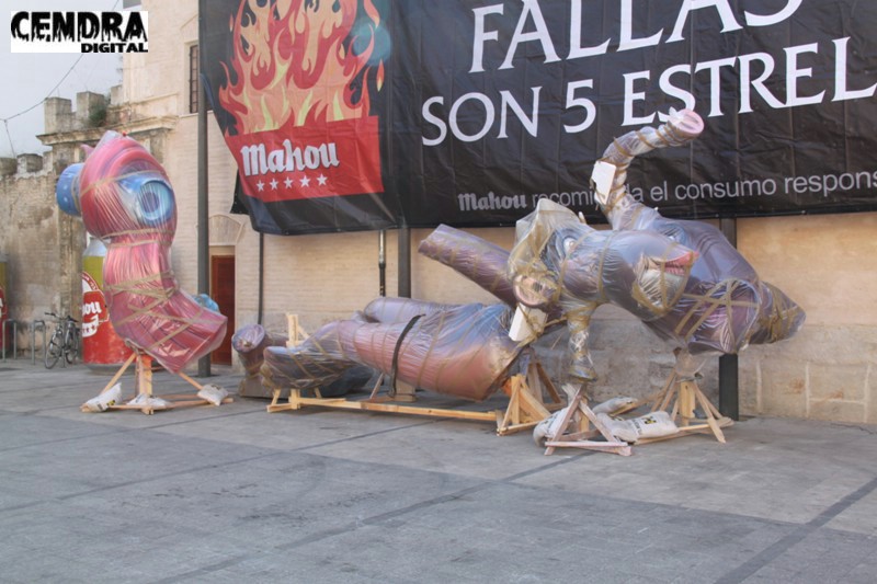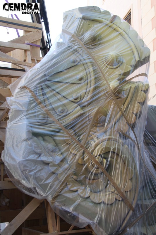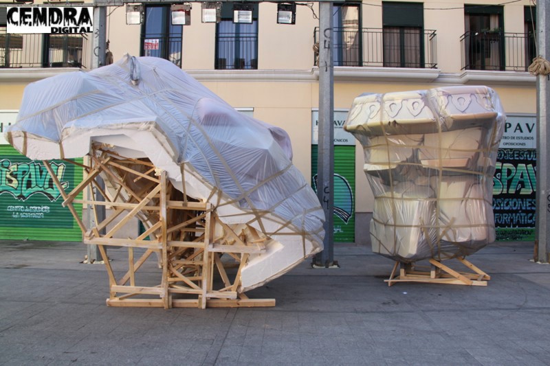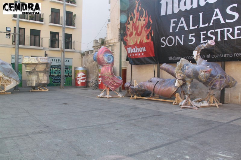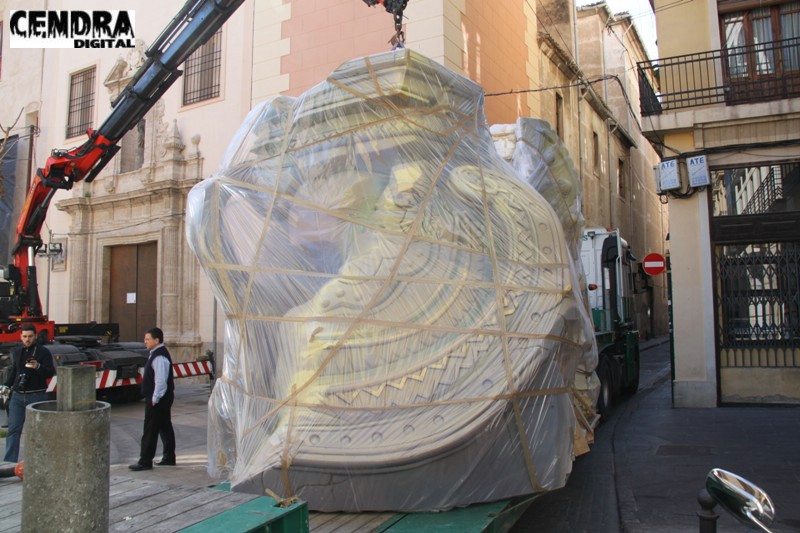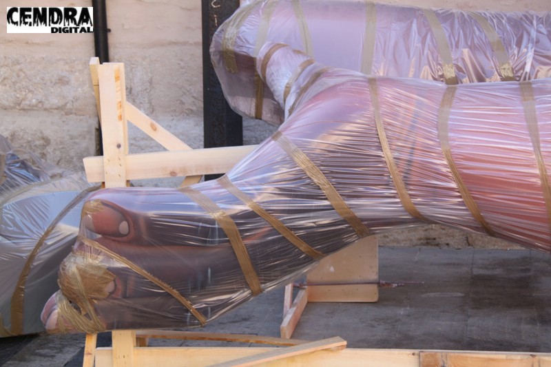 Fotografías de las primeras piezas que han llegado a la Plaza del Pilar de la falla que está realizando José Sanchis.