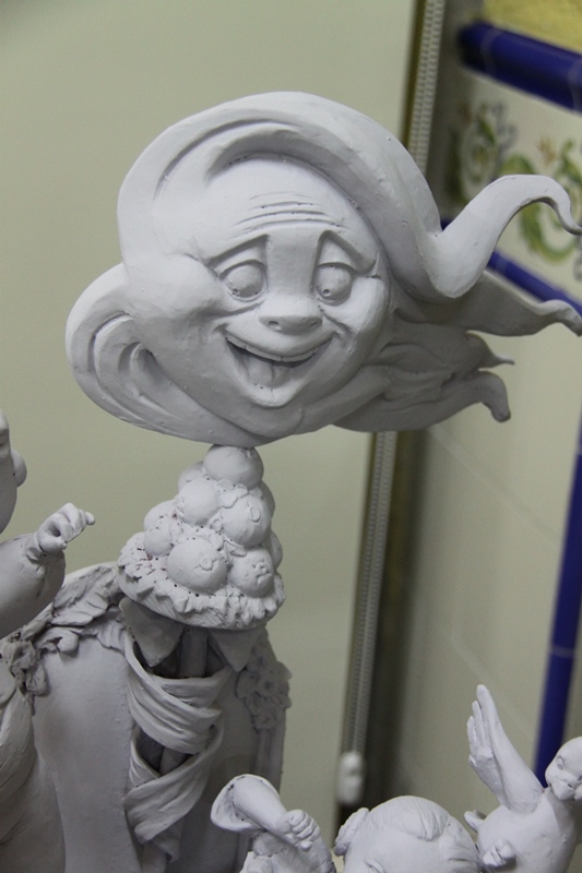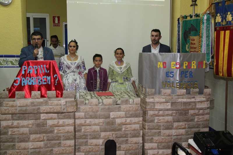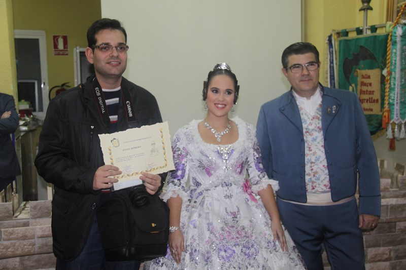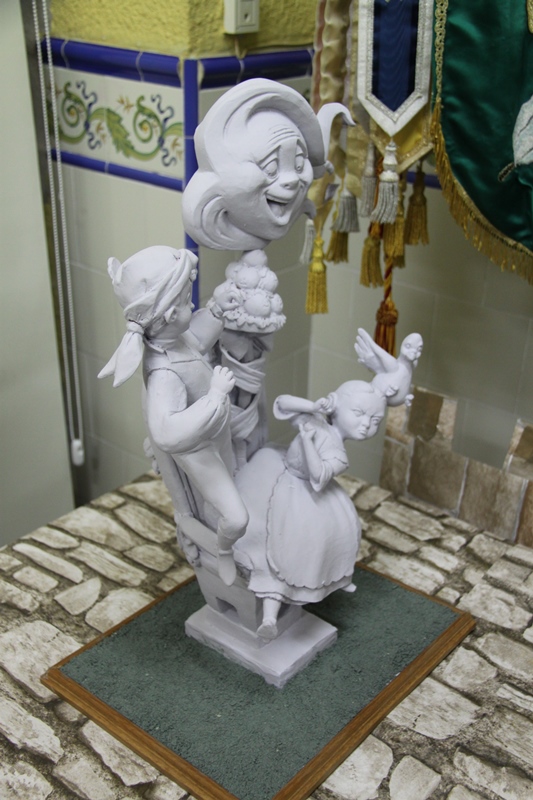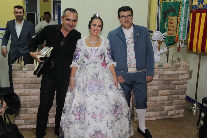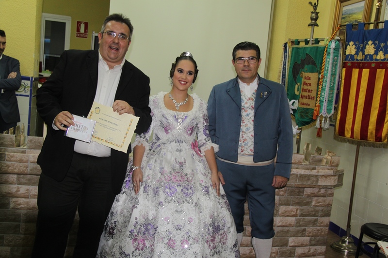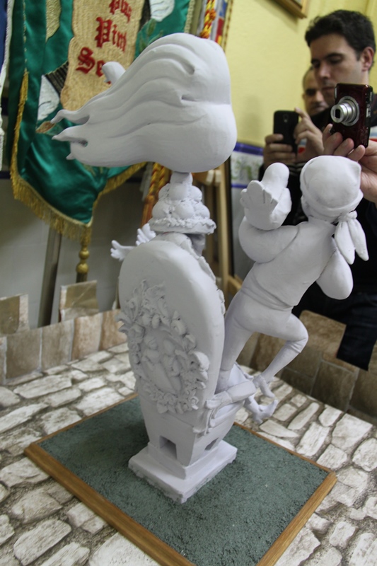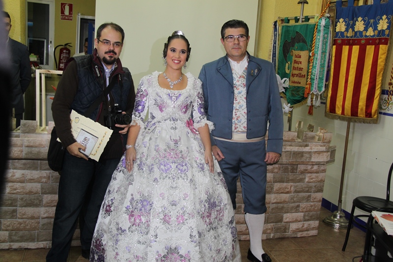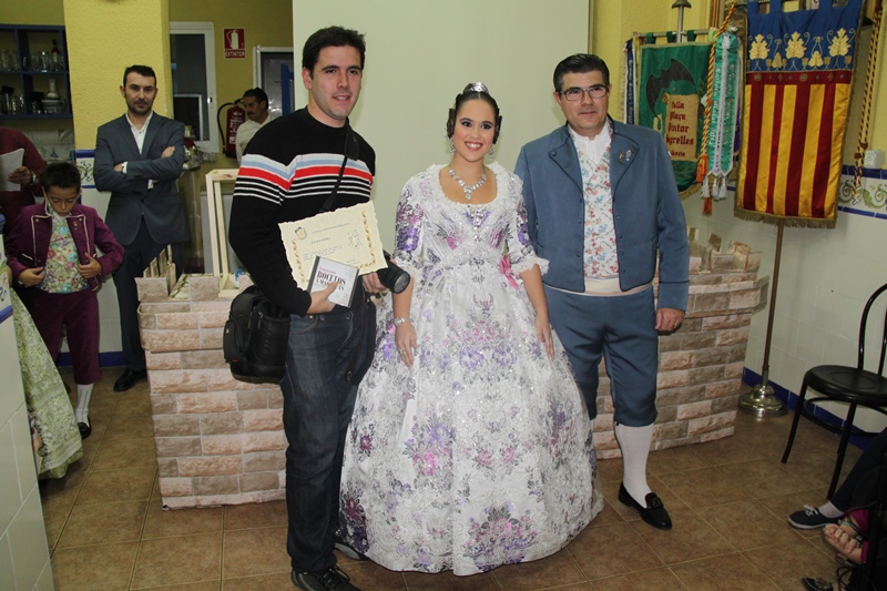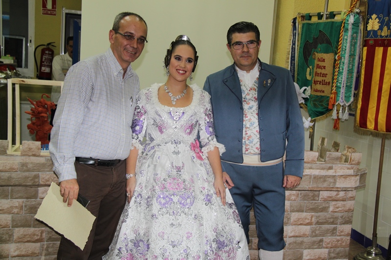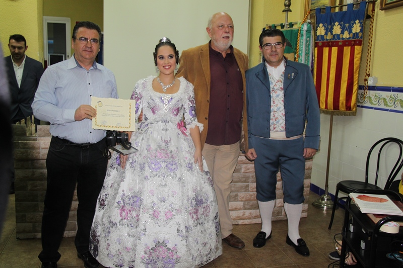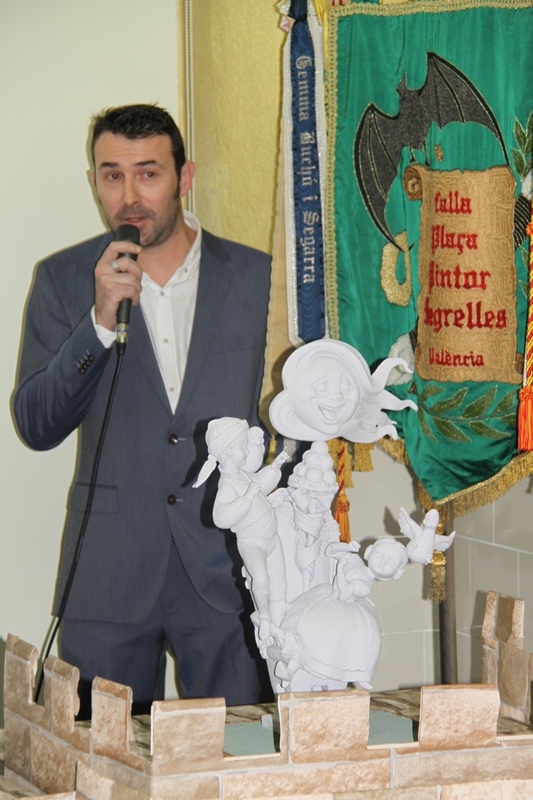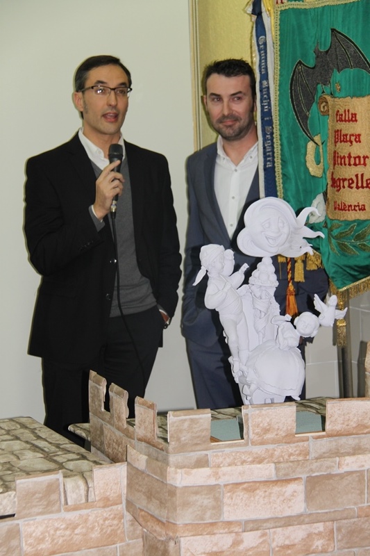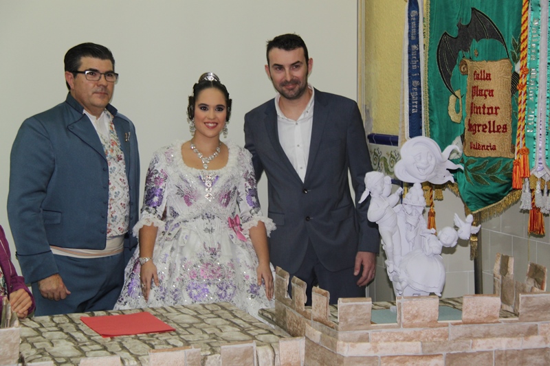 La comisión de la Plaza del Pintor Segrelles ha presentando el boceto y la maqueta de la falla que les realiza José López «Selfa» y homenajeado a la prensa fallera, grandes protagonistas de la escena trasera de la falla grande.
