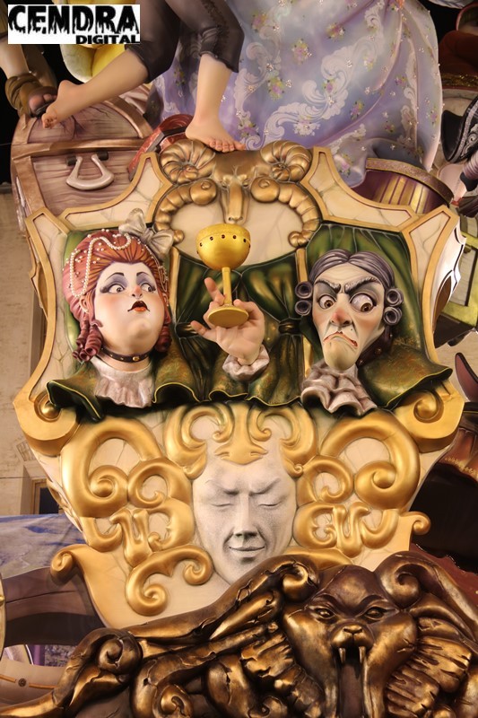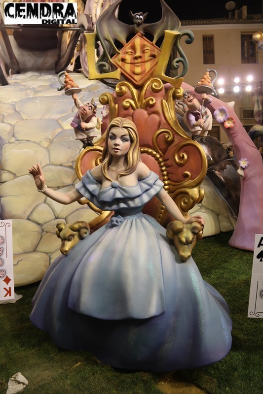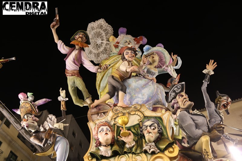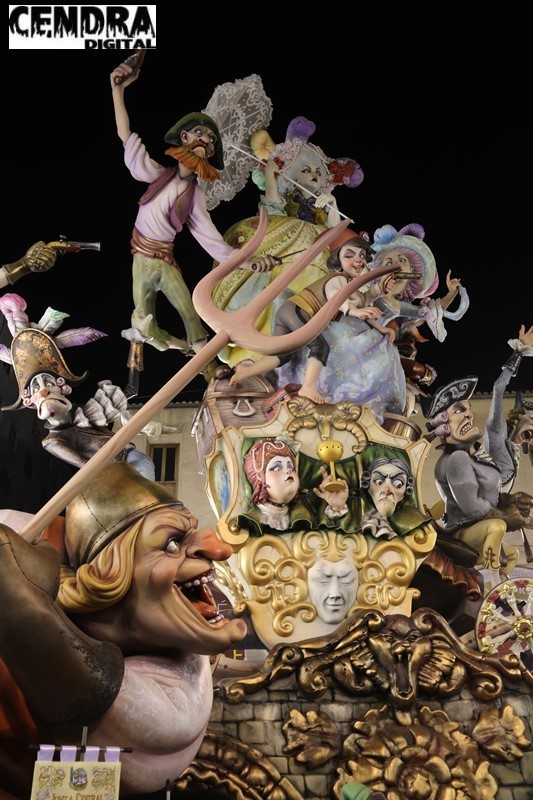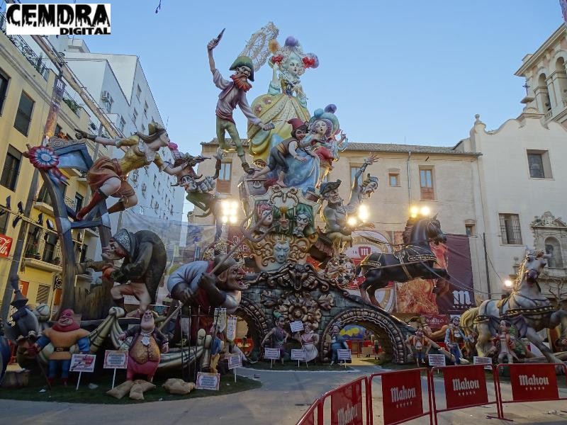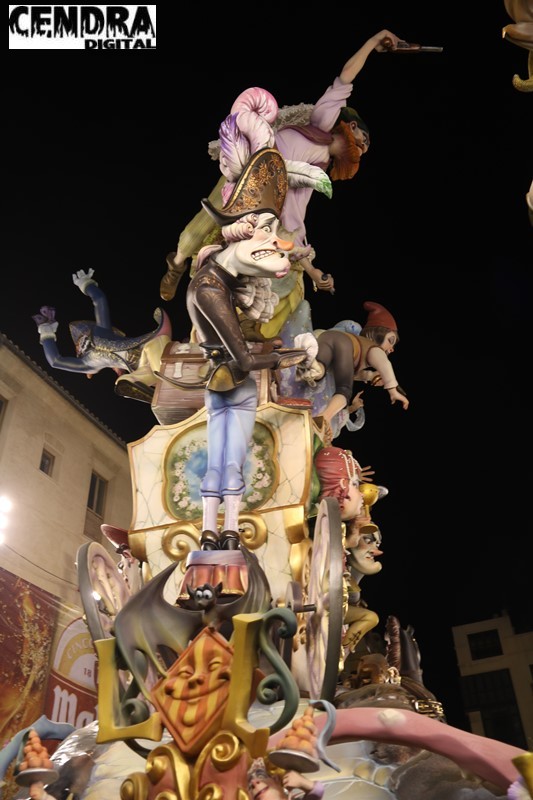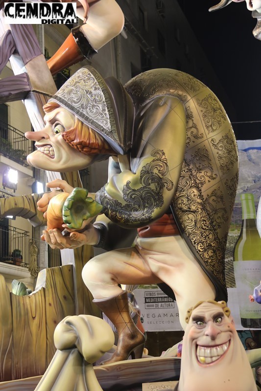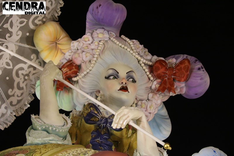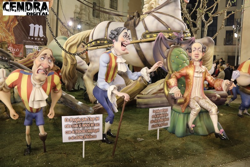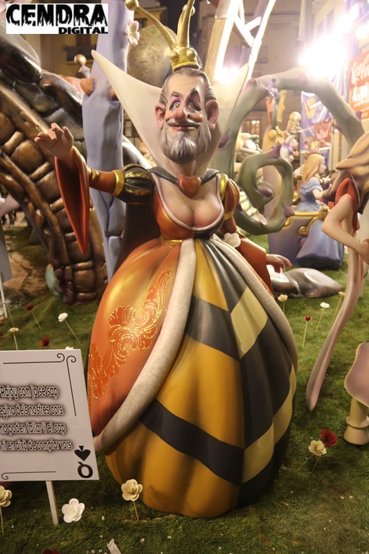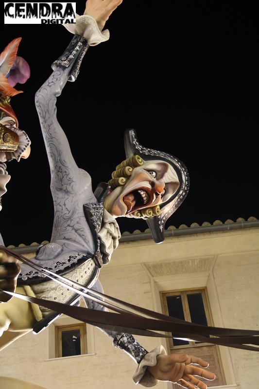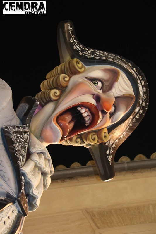 Fotografías de la falla ganadora del segundo premio de sección especial plantada por Paco Torres en la Plaza del Pilar y cuyo lema es “Que li tallen el cap”.