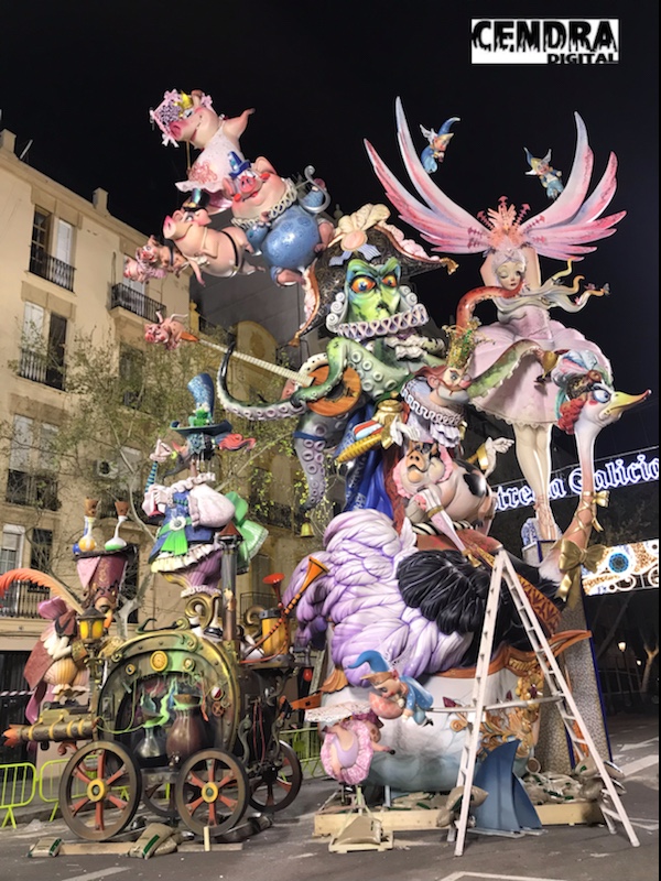 Fotografías del estado de la plantà de la Falla Reino de Valencia-Duque de Calabria, obra de Sergio Musoles, en el momento en el que se tuvo que detener. Su lema es «Malamente».