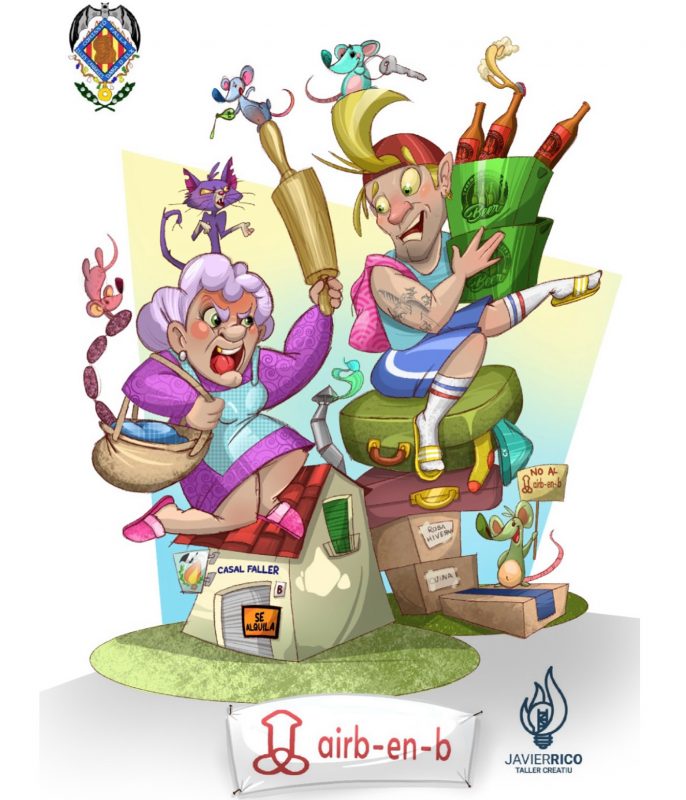 La Falla Islas Canarias-Dama de Elche presenta los bocetos de las fallas que van a plantar Javier Rico («Airb-en-b») y Pepe Gómez («Festes de fa molts anys») en 2025.