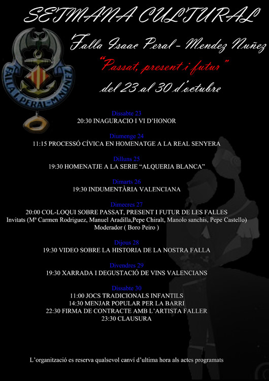 El sábado 23 de octubre comienza la semana cultural de la Falla Isaac Peral-Méndez Núñez, en la que destaca la presentación de bocetos (sábado 30) y un interesante coloquio sobre el pasado, presente y futuro de las fallas con Mª Carmen Rodríguez, Pepe Chiralt, Pepe Castelló, Manolo Sanchis, Manolo Aradilla. y Boro Peiró (miércoles 27).