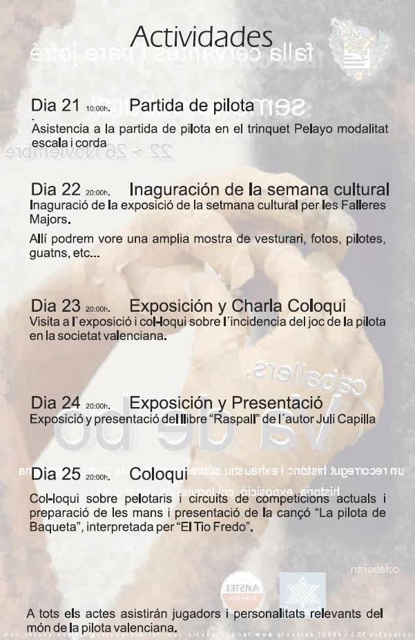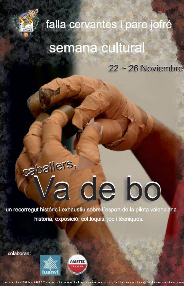 La Falla Cervantes i Pare Jofré inaugurará el próximo lunes día 22 su Semana Cultural, dedicada este año a la historia de la Pilota Valenciana. La cita tendrá lugar en el Casal de la Falla y contará con la presencia de nuestras Falleras Mayores, Lorena y Marta. Durante la semana se podrá disfrutar de exposiciones, charlas y coloquios, así como la presentación del libro «Raspall» del autor Juli Capillla.