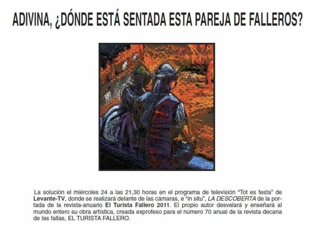 El miércoles se desvelará la portada del Turista Fallero 2011 en el programa «Tot es Festa» de Jaume Bronchud en Levante TV, pero hasta llegar ese momento, la publicación nos propone la siguiente pregunta «Adivina, ¿dónde está sentada esta pareja de falleros?.