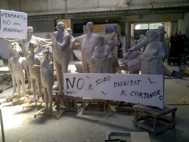 Divertida imagen la que nos hace llega Juane Cortell desde su taller, en el que los ninots de cartón le han recibido con una particular manifestación reivindicativa.