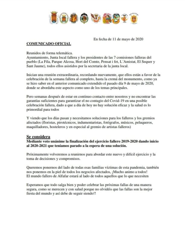 Esta nit la junta Local Fallera d’Alfafar amb la seua presidenta al capdavant, a reunit a les 7 falles i regidor de manera telemàtica per a avaluar la situació en este moment i donar suport a la celebració o no de l’exercici faller 2020, tant els presidents com la junta local i l’ajuntament, han decidit que el millor per a la salut, es lo següent (sempre anant endavant amb el reglament i el pro de la celebració de la festa fallera):